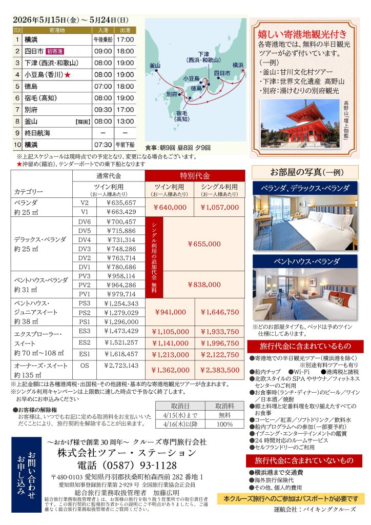 バイキング・エデンは今夏以降、ヨーロッパへの配船が決定しており、日本発着でご乗船いただける最後のチャンスにつき、今回のクルーズは「ラストチャンスキャンペーン」適用の特別価格でご案内。