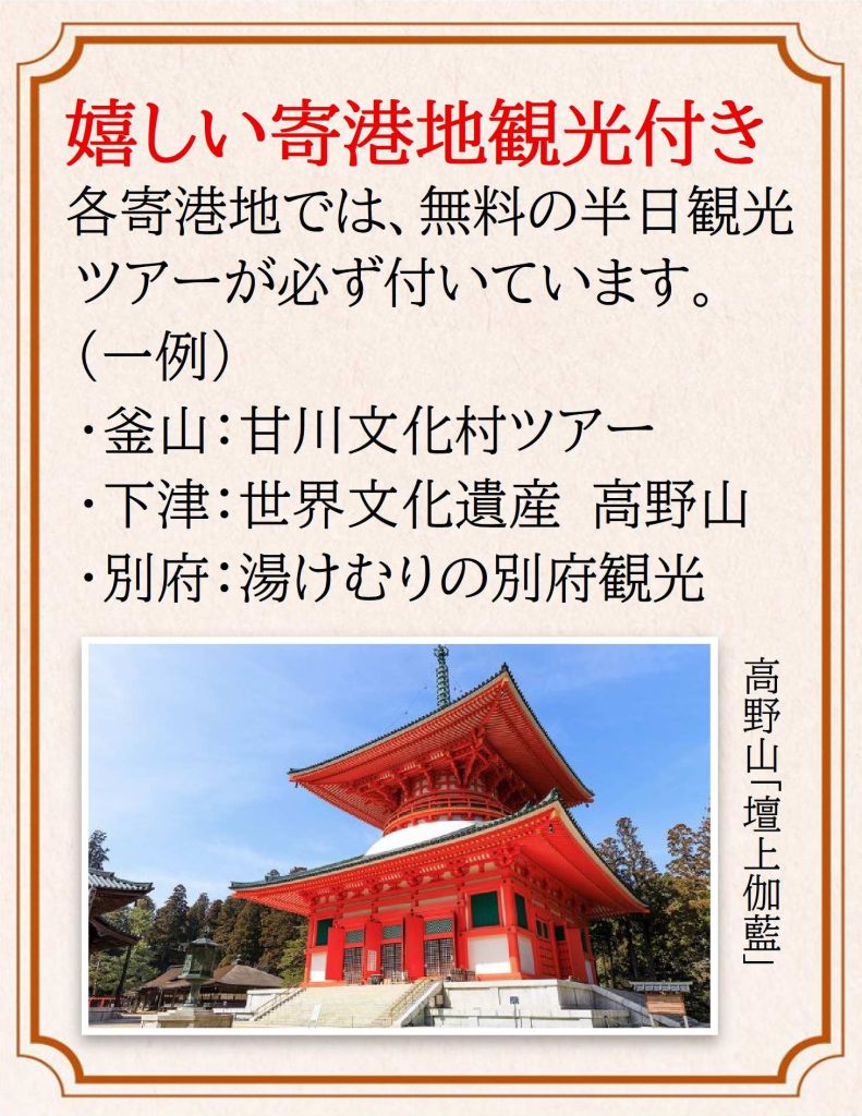 各寄港地では 無料の半日観光ツアー が用意されています。